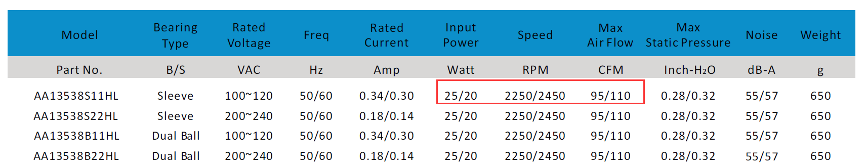 對(duì)比于AC13538風(fēng)扇,最大轉(zhuǎn)速為2450RPM,風(fēng)量對(duì)應(yīng)為110CFM,功率卻達(dá)到了20W,最大風(fēng)量沒(méi)達(dá)到AF13538風(fēng)扇的風(fēng)量,但功率是其2倍多,也即功耗是AF13538的2倍多。