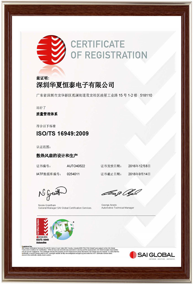 ISO/TS 16949:2009證書的獲得,使我司成為國內(nèi)為數(shù)不多獲得TS16949認(rèn)證的散熱風(fēng)扇制造企業(yè)。