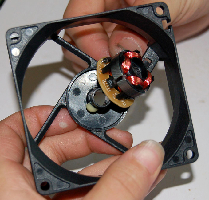 根據(jù)安培右手定則,導(dǎo)體通過電流,周圍會(huì)產(chǎn)生磁場,若將此導(dǎo)體置于另一固定磁場中,則將產(chǎn)生吸力或斥力,造成物體移動(dòng)。在直流散熱風(fēng)扇的扇葉內(nèi)部,附著一塊事先充有磁性之橡膠磁鐵。環(huán)繞著硅鋼片,軸心部份纏繞兩組線圈,并使用霍爾感應(yīng)組件作為同步偵測裝置,控制一組電路,該電路使纏繞軸心的兩組線圈輪流工作。硅鋼片產(chǎn)生不同磁極,此磁極與橡膠磁鐵產(chǎn)生吸斥力。當(dāng)吸斥力大于散熱風(fēng)扇的靜摩擦力時(shí),扇葉自然轉(zhuǎn)動(dòng)。由于霍爾感應(yīng)組件提供同步信號(hào),扇葉因此得以持續(xù)運(yùn)轉(zhuǎn),至于其運(yùn)轉(zhuǎn)方向,可依佛萊明右手定則決定。